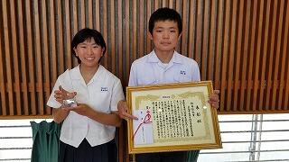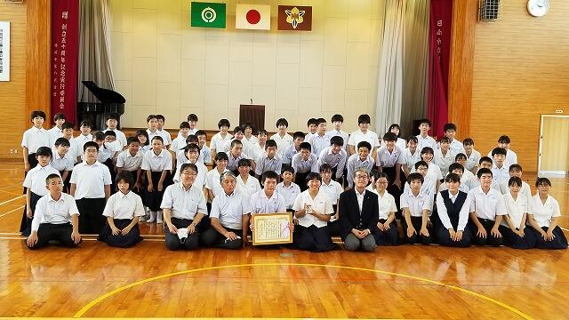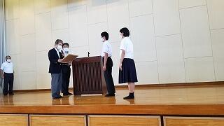 6月24日(金)に日向東ロータリークラブの会長 江川昌義 様、幹事 三樹 賢一郎 様、次年度会長 岡田 基継 様が来校され「鮫島哲也賞」の授与式が行われました。昨年度の美々津中学校の『いじめの未然防止に関する取組』が評価されました。今年度も継続して【やさしい言葉の花】の制作活動を行っていきます。