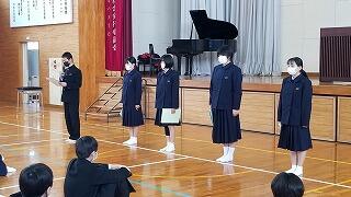3月24日(金)修了式を行いました。各学年代表生徒が壇上にて修了証書を受け取りました。次に、各学年代表生徒が今年度の反省と抱負を述べ、校長先生の話の中で「この1年間、皆さんは大変よく頑張りました。」とねぎらいの言葉をいただきました。全校生徒が一生懸命に校歌斉唱を行い、締めくくりにふさわしいすばらしい修了式となりました。