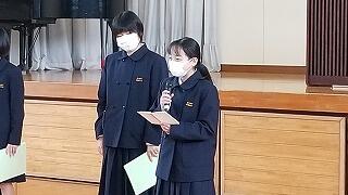 式の後には、学習面、保健面、生活面について担当の先生方からのお話があり、次に生徒会からの各専門委員会の反省等が報告されました。最後に生徒会長より、「転勤される先生方はまだ分かりませんが、離任式までの間の先生方との貴重な時間、ふれあいを大切にしましょう。」という言葉がありました。