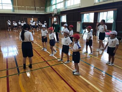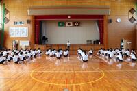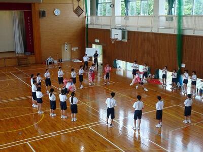 がら中学校を出発し、小学校へ向かいました。小学校に着くと、体育
