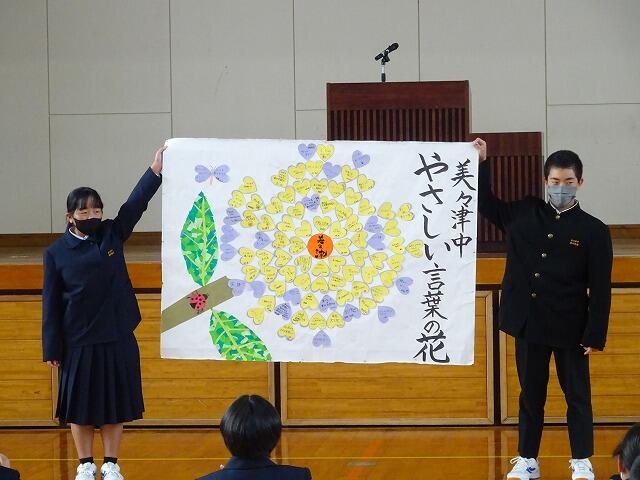 12月2日(金)の5校時に全校生徒で2学期の「やさしい言葉の花」制作を行いました。生活委員会が昨年度から継続して取り組んでいる活動で今回で5回目になります。1学期に制作した紫色の花びらの上に、今回は黄色い花びらを重ねて鮮やかな言葉の花が出来上がりました。正面玄関から入った所の掲示板に貼ってありますので、ご来校の際はぜびご覧ください。