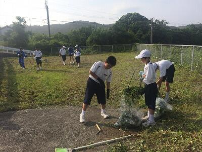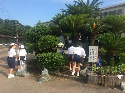 雨で延期とはなりましたが、昨日は藤間部長を中心に大勢の保護者の皆様方(40名以上)に参加していただき、構内の草刈りやグラウンドの芝刈り、木々の枝払いまで多くの作業を積極的にしていただきました。生徒諸君も、草刈りをしたり、刈った草や切った木々を集め運んだりしてくれました。おかげさまで、校内が見違えるようにすっきりとしました。改めて美々津中は、子ども達だけではなく、保護者の結束も素晴らしいなと感じた次第です。子ども達の素直さと保護者の学校への協力に感謝しながら、職員一同も心を合わせて、今後も質の高い教育を目指していきたいと思います。ありがとうございました。