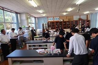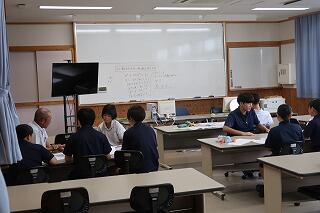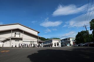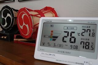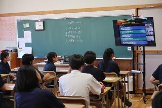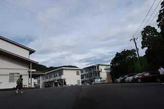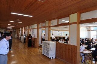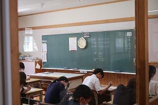 1時間目が終わる頃(9時過ぎ)は日差しが降り注いでいます。玄関(校舎内)の気温28.8℃、湿度78.5%でやや暑さを感じます。生徒が勉強している教室は朝からエアコンを使い、室内の気温は26~27℃程度で、扇風機も併用しています。