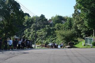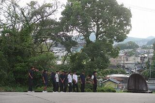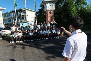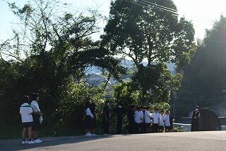 雲があるものの、今日も暑い朝の登校です。今朝のあいさつ運動の担当は3年2組でした。終わった後は時計台の前で記念撮影です。