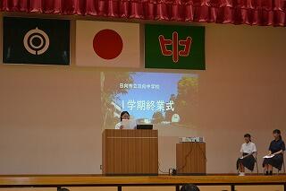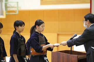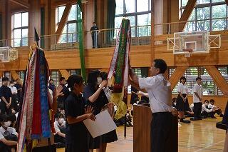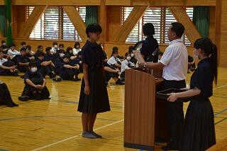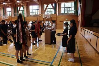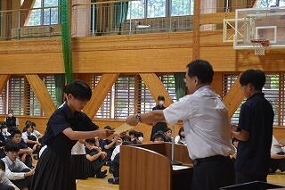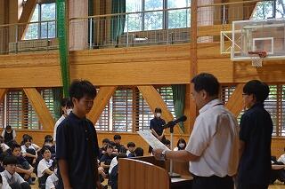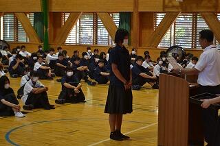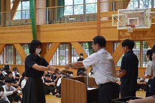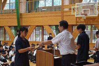 先日開催された「日向地区中学校総合体育大会」で入賞した部及び生徒の表彰を6間目に行いました。