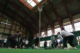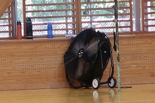 フロアに大型扇風機を置き、熱中症対策がしてありました。授業後、生徒が使用したラケットはきれいに並べてケースに片付けてありました。