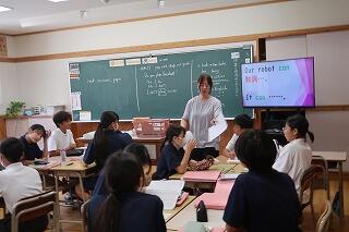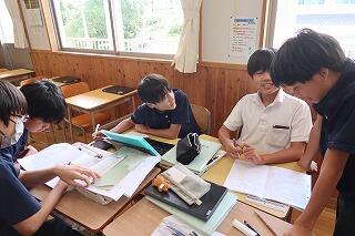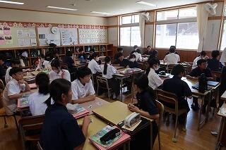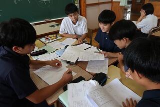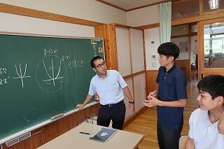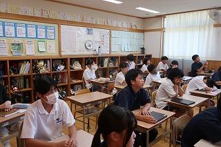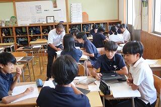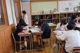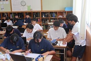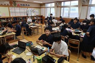3時間目の3年生の教室は数学の授業が行われていました。今日の内容は、授業の後半でしたので、それぞれの生徒の考えで二つの教室を使い、グループ学習や個人での学習を行っていました。