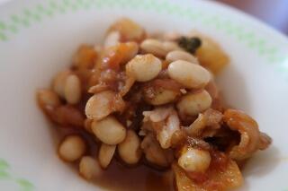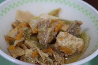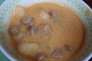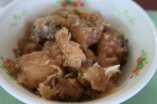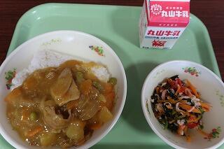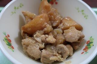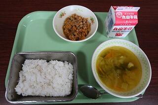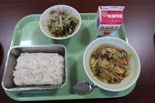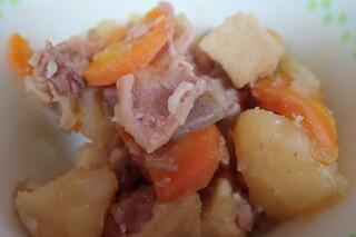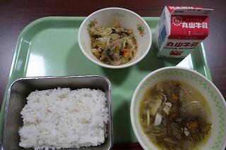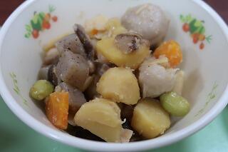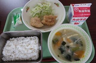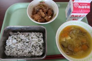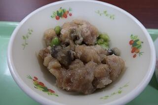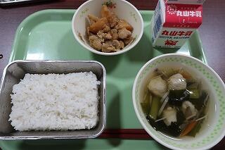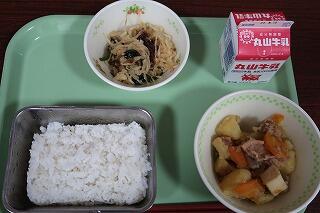 【10月7日(月)】麦ご飯、鶏肉とジャガイモの揚げ煮、イカだんごのすみれ汁