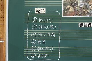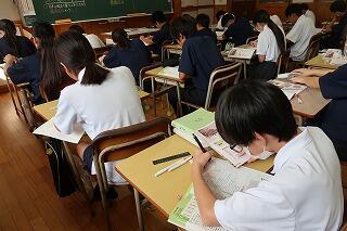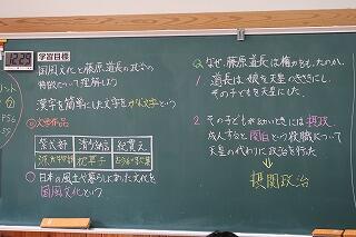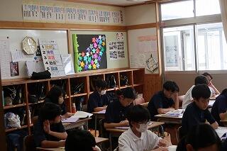 1年生の社会科の授業では、現在放送中の大河ドラマと同じ時代の文化や政治のことを勉強していました。授業の後半、板書をノートに写し、終わった生徒はワークで復習をしていました。