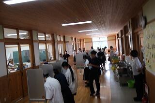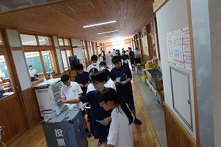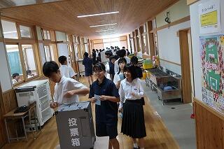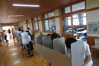 演説が終わった後は各学年の廊下に設置してある記載台で投票用紙を記載して投票しました。投票に使った記載台や投票箱は日向市選挙管理委員会からお借りしたものです。