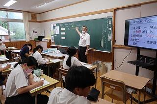 1時間目の授業のようすです。黒板には各教科でこの時間に勉強している内容が書いてありました。また黒板の横にある大型テレビにポイントを提示している授業もありました。