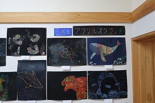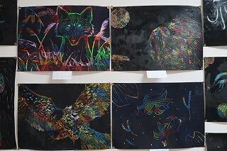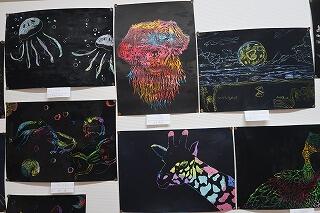 3年生が美術の授業で制作した「アクリルスクラッチ」の作品が校内掲示板に展示してあります。白い画用紙にアクリル絵の具で思い思いに色を塗り、その上に黒い絵の具を重ね塗りします。その後、細い針で表面をひっかいて絵を描くと下地のカラフルな色が線として現れ、絵になります。