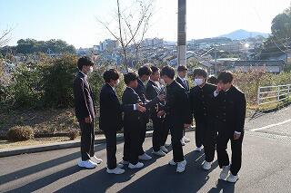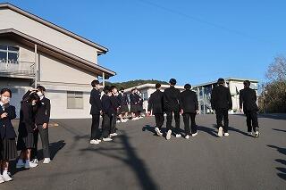 明日は卒業式です。今朝もよく晴れていて、空は青く澄み渡っていました。希望の坂道や玄関周辺では、生徒会役員や今日の担当学級の生徒など多くの生徒があいさつ運動を行っていました。