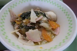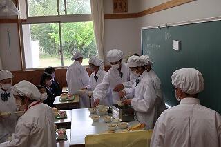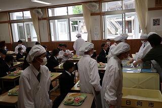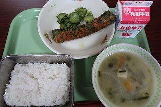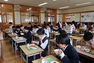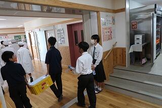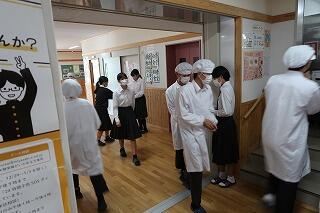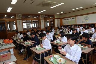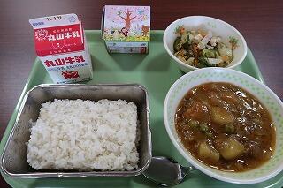 今日は3年生にとって中学校最後の給食でした。献立は、生徒に人気の「カレーライスとりっちゃんサラダ」そして「お祝いのケーキ」でした。