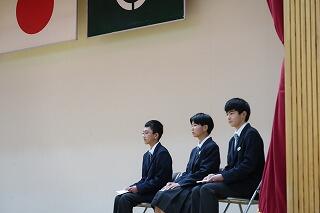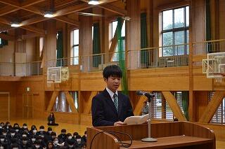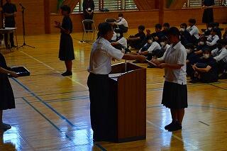 新任式に引き続き始業式を行いました。式では各学年代表及び生徒会代表生徒が新学年の抱負を発表し、その後、校長が「新学期にあたって」話をしました。
