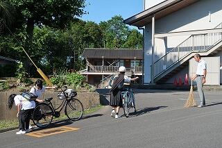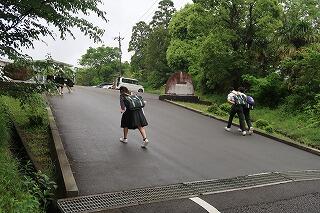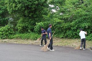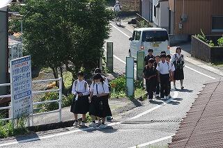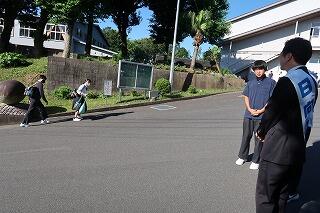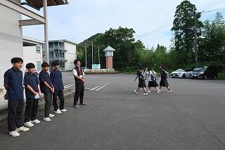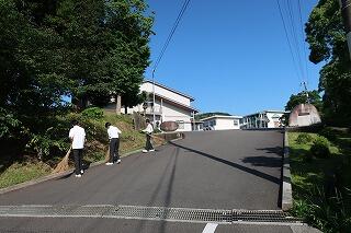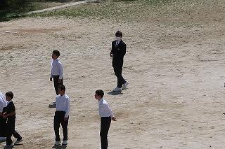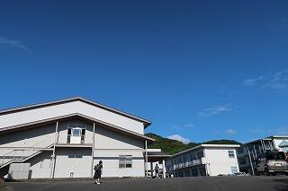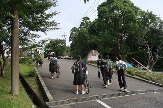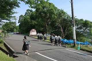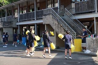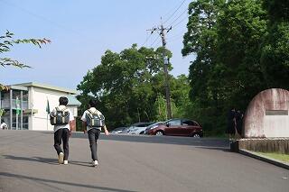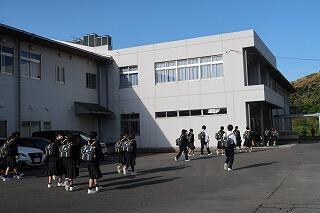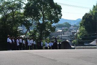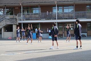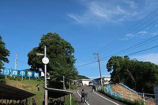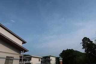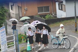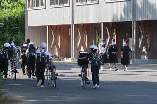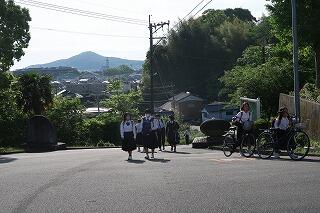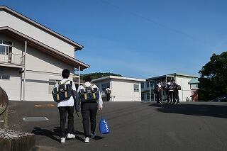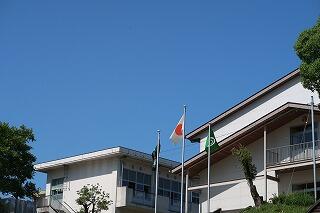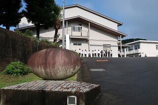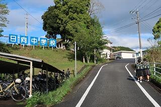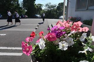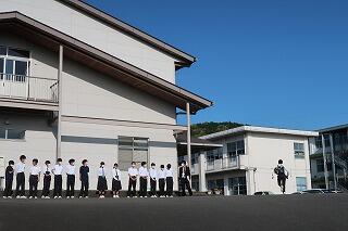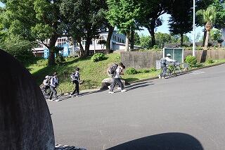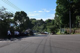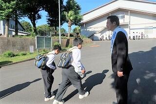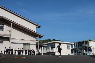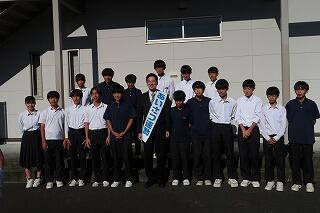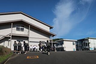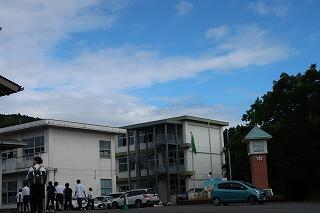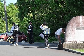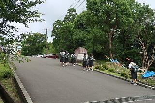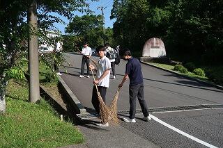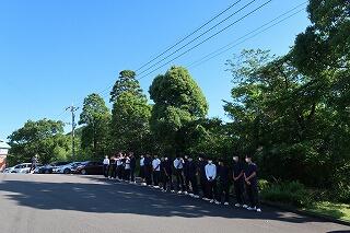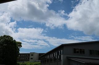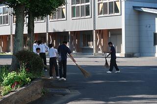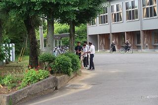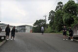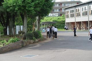 所々に雲はあるものの、日向市は朝からよく晴れています。強い日差しを避けて、サッカー部の生徒があいさつ運動をしています。また美化委員会の生徒は学年で曜日を決めて校門周辺の清掃をしています。ありがとうございます。