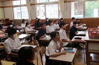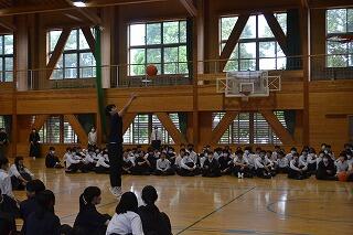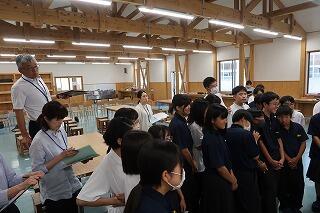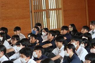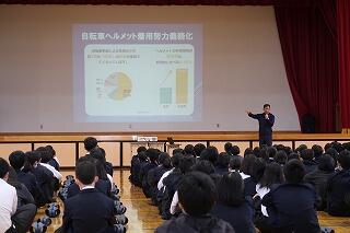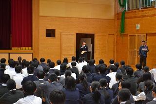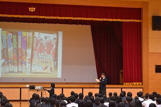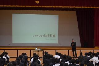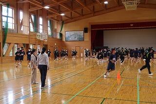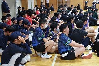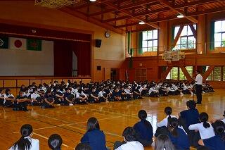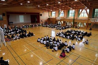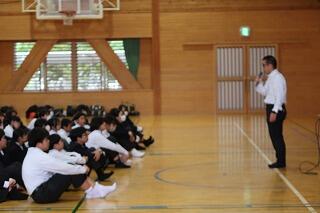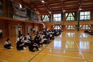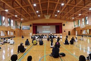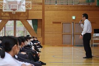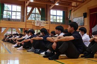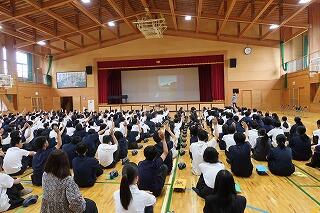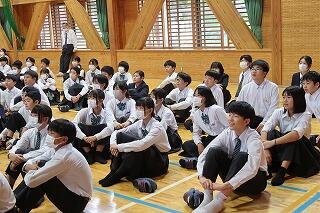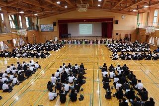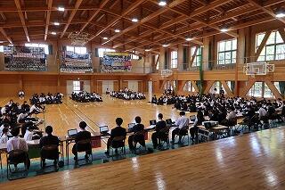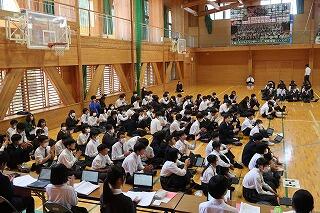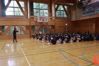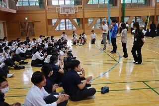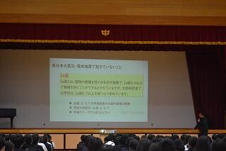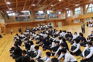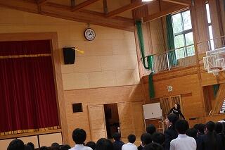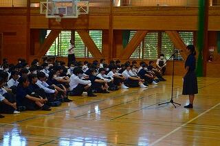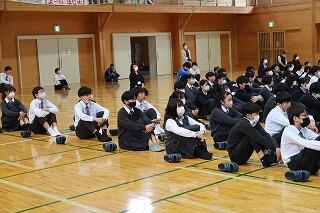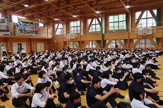 4時間目と5時間目は全校生徒が体育館に集合し、防災や学習、清掃についてのオリエンテーションを行いました。今週は「避難訓練週間」を設定し、学校で地震などの強い揺れを感じたときの「命を守る行動」についても確認しました。