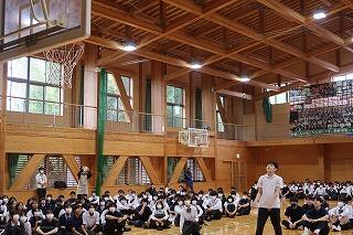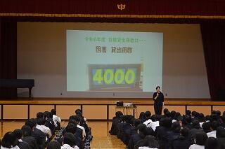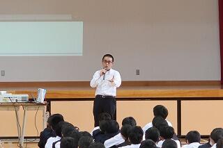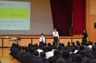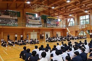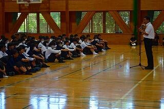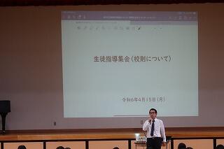 【全校集会】学級担任・副担任、部活動顧問等の発表のあと、学習面、保健面、生活面の話を行いました。