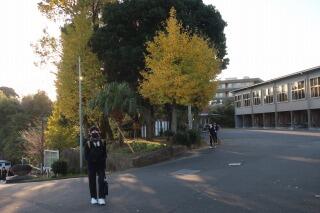 週末金曜日です。今朝も冬の寒さでした。あいさつ運動は二年生の学級でした。黄色く色づいた銀杏の葉は校門付近で落ち葉になっています。