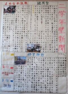 生徒玄関を入ると正面の掲示板に「壁新聞」が3枚張ってあります。これは生徒会広報委員会の11月・12月の活動で各学年の広報委員会の生徒が作成したものです。来校された折にご覧ください。