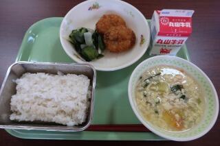 【12月16日(月)】麦ご飯、たこやきカツ、添え野菜、ニラ玉汁