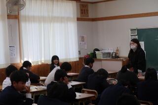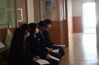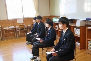 12月19日(木)、23日(金)の2日間にわたり、3年生の高校入試に向けた「面接」の練習を「よのなか先生」にお越しいただいて行いました。これまで3年担当の先生や校長、教頭、教務主任などを面接官とした練習を行ってきましたが、普段会うことや話したことのない方からの面接にとても緊張していました。