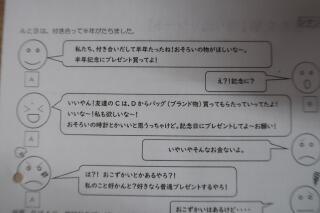 登場人物の気持ちを絵で考えて、タブレットに描き、その後で大型テレビで提示して学級全体で他の人の考えたものを見ました。
