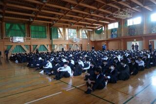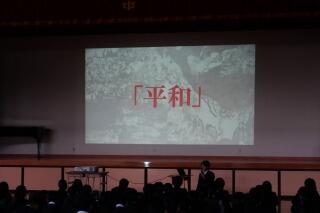 12月12日(木)、生徒会主催の「平和集会」を行いました。集会では、修学旅行を終えた2年生の代表生徒と夏休みの沖縄県浦添市への平和交流団に参加した3年生、長崎市のピースフォーラムに参加した3年生が、それぞれ学んだことをスライドを使って発表しました。発表を聞いて、過去の痛ましい歴史や「平和」であることのありがたさを全校生徒で考える集会でした。