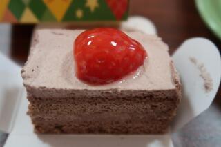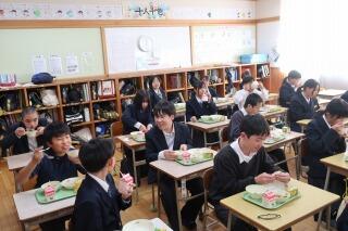 少し早いのですが、今日の給食にはデザートとしてケーキが出ました。ケーキは3種類あり、事前に学級ごとに種類を決めていて、最も多かったのはチョコレートケーキでした。また、スープには星の形のにんじんやパスタが入っていました。