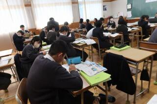 日向中学校では、道徳の授業は学級担任だけではなく副担任を含め、学年の先生全員で担当しています。写真は一昨日の2年生の道徳の授業のようすです。担当の先生が資料を朗読し、その声を聞きながら生徒も黙読していました。その後は発問に答えながら登場人物の考えを通して自分を見つめる時間になるように計画してありました。