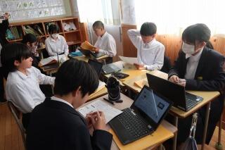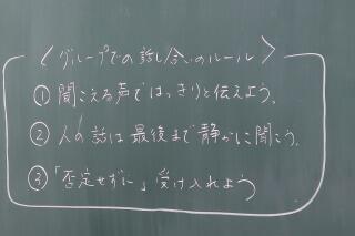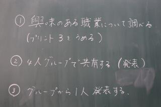 1年生は「総合的な学習の時間」にインターネットのサイトを利用した「 職業調べ 」を行っています。今日の授業は、前半は「興味のある職業」の仕事内容や仕事の魅力をサイトを使って調べ、後半は調べたことをグループや学級全体で共有する流れでした。その中で、「話し合いのルール」についても確認していきました。