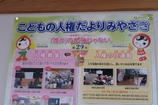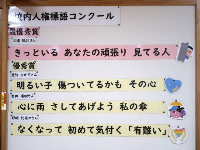 日向中の玄関を入るとすぐの掲示板に、1学期に生徒から募集した人権標語が掲示してあります。