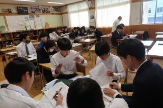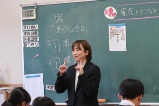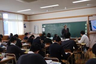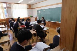 日向中学校では、道徳の授業は学級担任だけではなく副担任を含め、学年の先生全員で担当しています。写真は一昨日の2年生の道徳の授業のようすです。担当の先生が資料を朗読し、その声を聞きながら生徒も黙読していました。その後は発問に答えながら登場人物の考えを通して自分を見つめる時間になるように計画してありました。