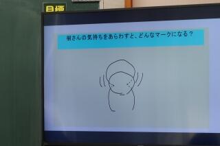登場人物の気持ちを絵で考えて、タブレットに描き、その後で大型テレビで提示して学級全体で他の人の考えたものを見ました。