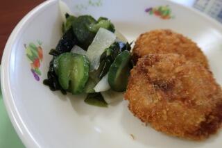 【12月16日(月)】麦ご飯、たこやきカツ、添え野菜、ニラ玉汁