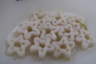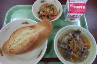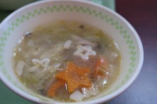 少し早いのですが、今日の給食にはデザートとしてケーキが出ました。ケーキは3種類あり、事前に学級ごとに種類を決めていて、最も多かったのはチョコレートケーキでした。また、スープには星の形のにんじんやパスタが入っていました。