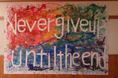 受験に向けた「三者面談」が終わり、3年生の受験目標が明確になりました。この時期、3年生の教室に向かう廊下には生徒会がメッセージを作成して掲示します。今年のメッセージは「 Never give up.  Until the End 」です。