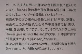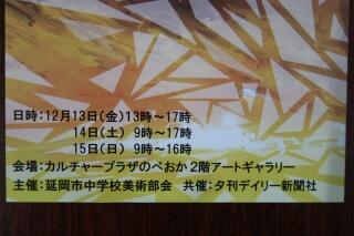 延岡市中学校美術部会の主催による美術展「 延創展 」が今日(12月13日(金))から開催されています。会場には延岡市の中学校授業や美術部の生徒の作品を中心に展示してありますが、県北全体に作品の呼びかけがあり、日向中の生徒の作品も展示してあります。会場は「カルチャープラザのべおか」です。お近くに行かれた際にはお立ち寄りください。