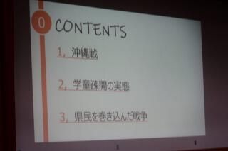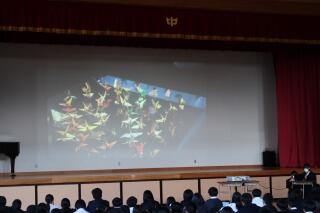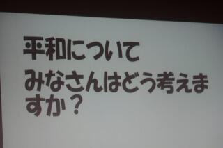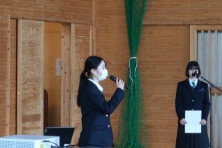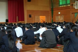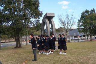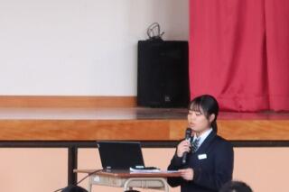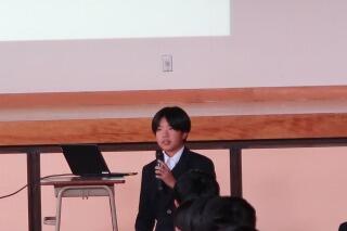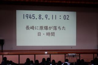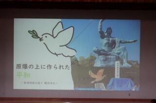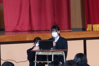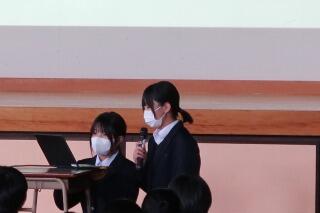 12月12日(木)、生徒会主催の「平和集会」を行いました。集会では、修学旅行を終えた2年生の代表生徒と夏休みの沖縄県浦添市への平和交流団に参加した3年生、長崎市のピースフォーラムに参加した3年生が、それぞれ学んだことをスライドを使って発表しました。発表を聞いて、過去の痛ましい歴史や「平和」であることのありがたさを全校生徒で考える集会でした。