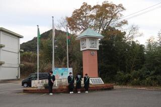12月第3週の月曜日です。週末から一層寒くなり、今朝の気温は4℃を下回っていました。今週も生徒会活動のあいさつ運動が続いています。今朝の担当は2年生の学級です。