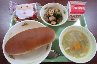 【12月19日(木)】減量チーズパン、豚肉とブロッコリーの照り焼き、ハッピースープ、クリスマスケーキ