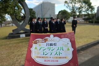 12月21日(土)、吹奏楽部の生徒が新富町文化会館で開催された「第50回県アンサンブルコンテスト」に2組12名出場しました。当日は中学の部が開催され、多くの中学生が出場し、金管や木管楽器、パーカッションの心地よい音色を披露していました。演奏の様子は撮影できませんでしたが、演奏終了後、集まって記念写真を撮りました。送迎してくださいました保護者の皆様、ありがとうございました。