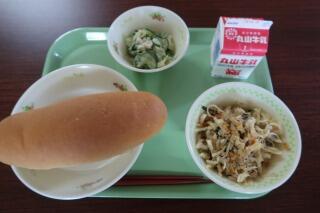 【11月12日(火)】ミルクパン、豚肉のリンゴソース和え、添え野菜、キャベツと卵のスープ