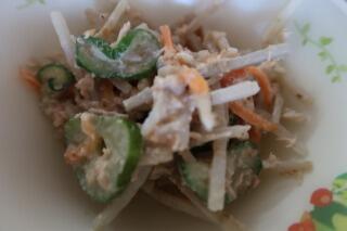 【11月18日(月)】麦ご飯、牛肉と大根のごま味噌煮、竹輪とキュウリの和えもの