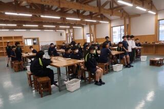 1年生は技術・家庭科の勉強で木材加工について勉強しています。今日は初めての「のこぎり引き」です。この時間は廃材に「けびき」をして、慣れない手つきで板を切っていました。初めてのこぎりを使い、不慣れな手つきで切っていました。