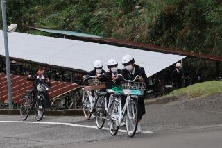 集合場所に来た時と帰りのようすです。ヘルメットをかぶり、1列で自転車に乗車しています。