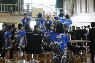 実行委員が中心となり、対面式踊りによる交流会が行われ、会場となった体育館には笑顔の花が咲きました。