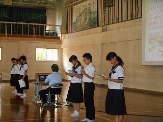 その後、修学旅行で平和学習をした2年生による峠三吉の詩の朗読と日向中平和宣言が行われました。