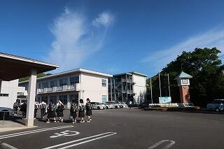 今日の日向は朝からよく晴れていました。希望の坂道から校舎を見ると澄み渡る青空が広がっていました。