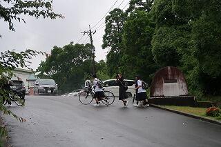 5月23日、今日は雨が降っています。雨の日は登校する生徒も大変そうです。徒歩通の生徒は傘を差し、自転車痛の生徒はカッパを着て登校し、希望の坂道を上ってきます。